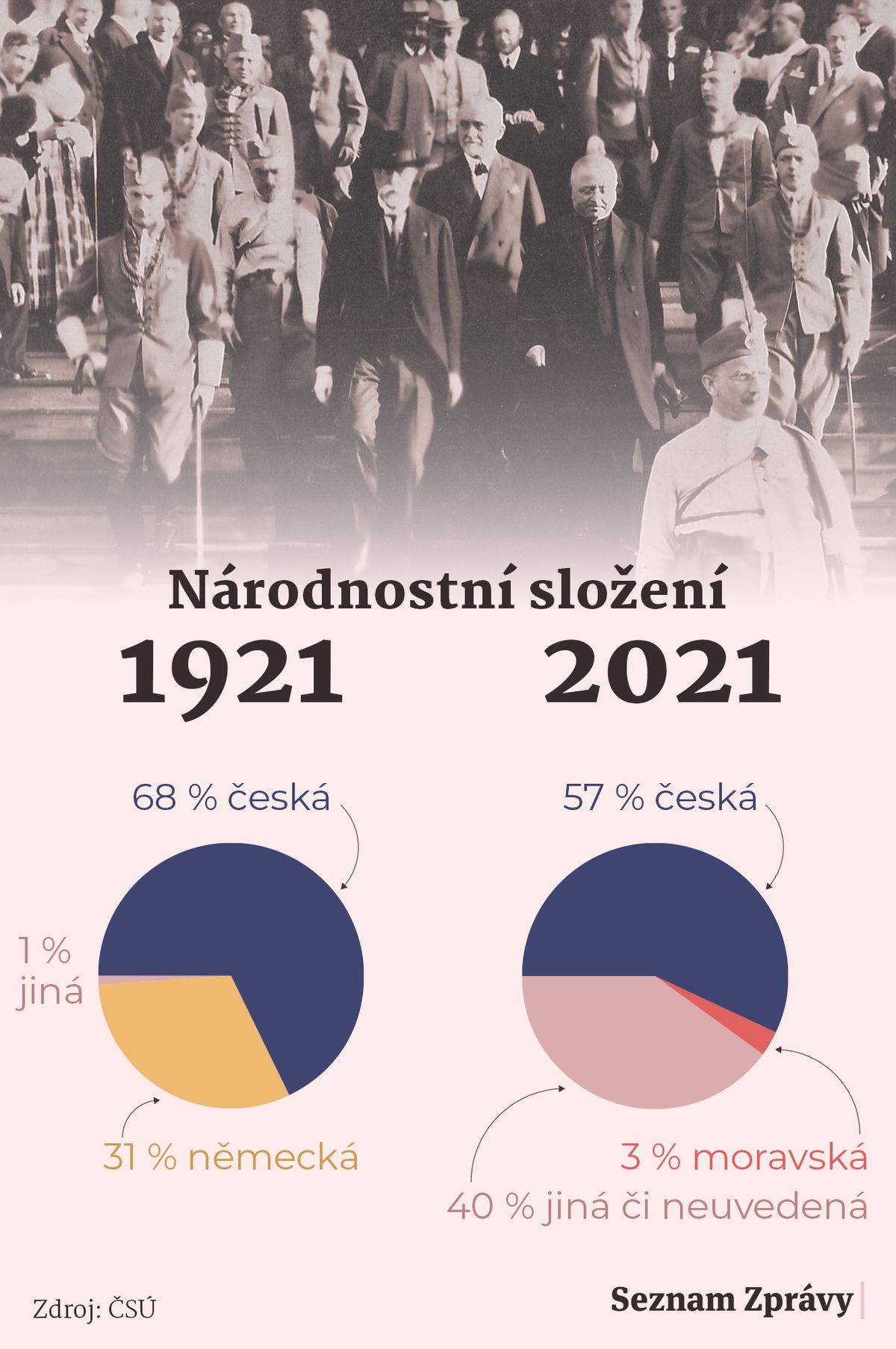 Zatímco v roce 1921 se třetina lidí žijící na českém území Československa hlásila k německé národnosti, o 100 let později to je 0,1 procenta obyvatel. Historické události, rozdělení Československa a následná globalizace proměnila národnostní strukturu. Podle odhadů dnes žije v Česku milion cizinců, z toho je 60 tisíc Vietnamců.
