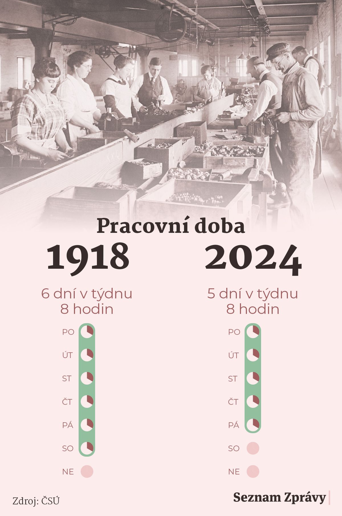 V prosinci 1918 zavedlo Československo společně s dalšími evropskými státy osmihodinovou pracovní dobu. To byla jedna z nejvýraznějších politických a hospodářských reforem první republiky. Ovlivnila rodinný život, způsob využívání víkendů i účast na správě menších obcí, jak uvedla pro Seznam Zprávy Renata Kyzlinková z Výzkumného institutu práce a sociálních věcí. Češi a Češky měli najednou více volného času než kdy předtím.