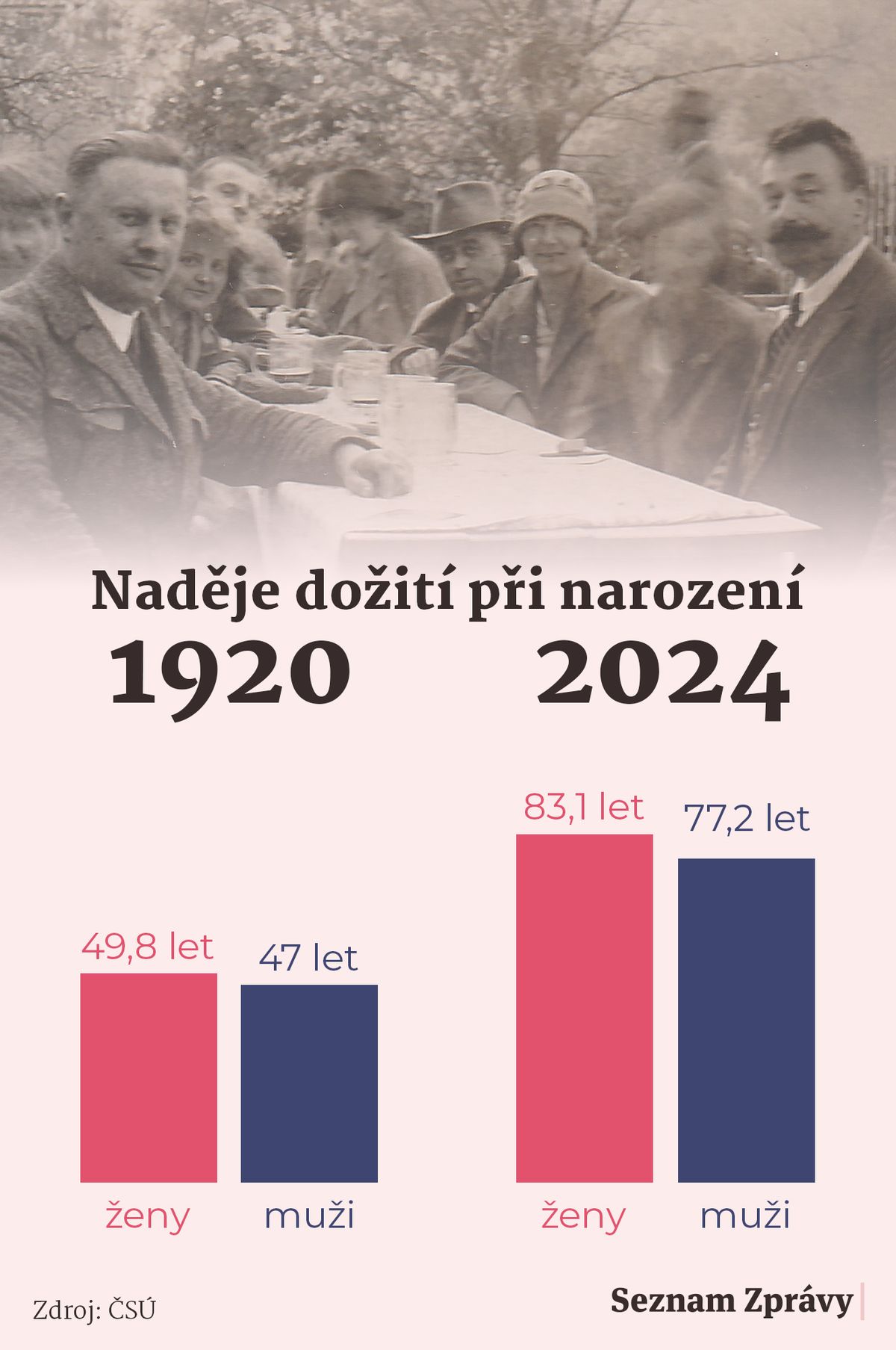 Když se na dnešním území Česka narodil člověk v roce 1920, bylo před ním průměrně ani ne 50 let života. Zatímco dnes statistici předpokládají délku života alespoň kolem osmdesátky. Důvodem je především stoupající životní úroveň a snížení dětské úmrtnosti.