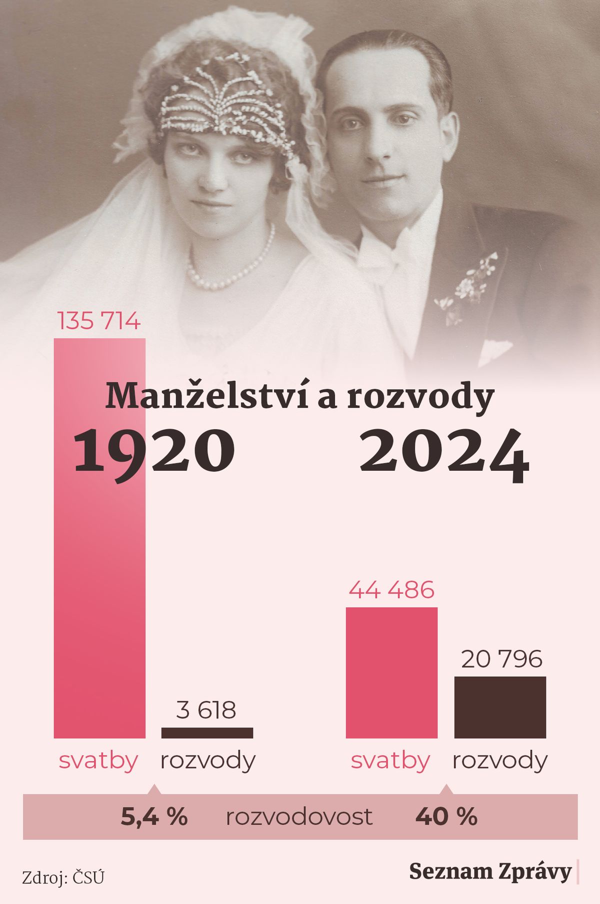 Před sto lety skončilo rozvodem pouze pět procent manželství. Rozvodovost začala narůstat po 2. světové válce, kdy se rozpadla desetina manželství. Dnes už to je 40 procent, a to průměrně po 13 letech.