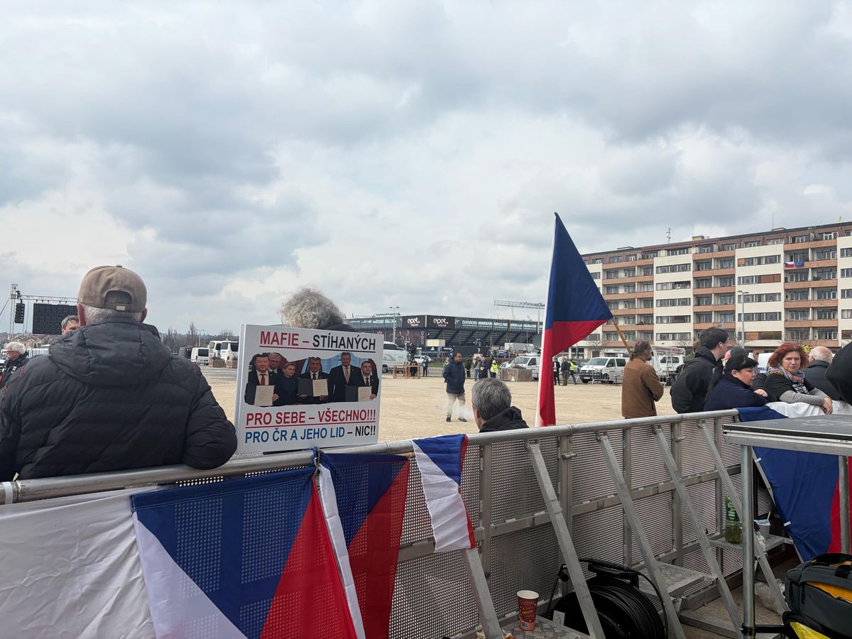 Mezi protestujícími je i pár z Ústí nad Labem. Štěpánka tu už byla v roce 2019, Patrik je na shromáždění na letenské pláni poprvé. Oběma vadí úpadek české reprezentace. „Třeba ta angličtina,“ říká Štěpánka směrem k vystoupení Filipa Turka v Bruselu.