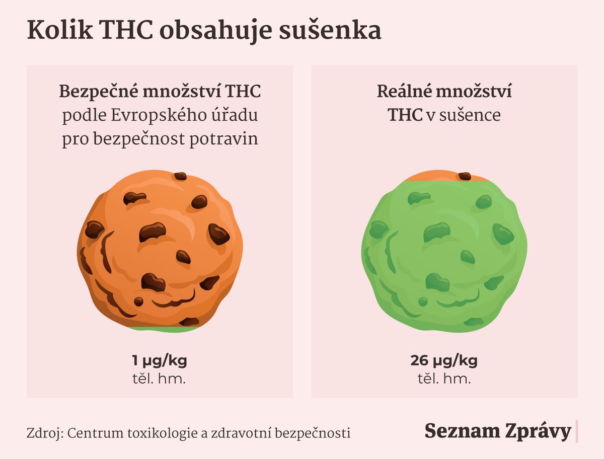 Porovnání bezpečné dávky THC s dávkou, kterou by po požití testované sušenky dostal 70kilový člověk. Grafika je ilustrační.