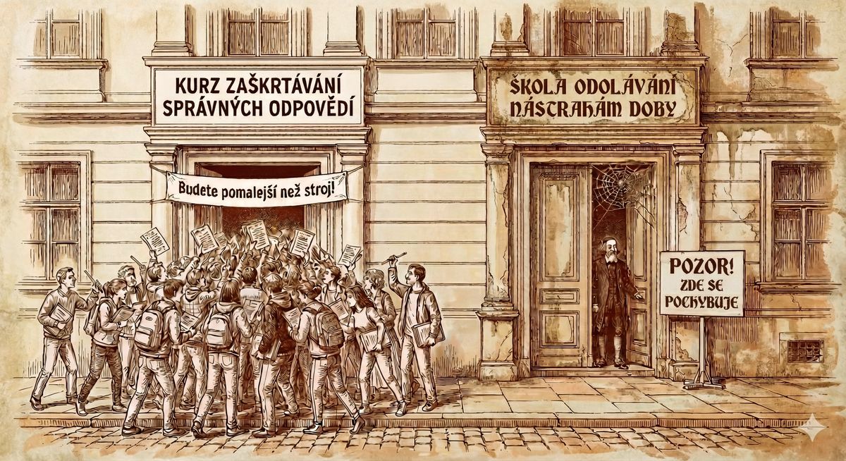 AI se vyjadřuje srozumitelně a odpovědi přehledně strukturuje. Jsou připravené k odevzdání. Přesně v té podobě, kterou škola po desetiletí vyžadovala. Školní systém cvičil žáky celé roky k tomu, že cílem není rozumět, ale včas dodat správnou odpověď. V požadované kvalitě. Teď to dělají bez zbytečných oklik. Systém dostal, co chtěl.