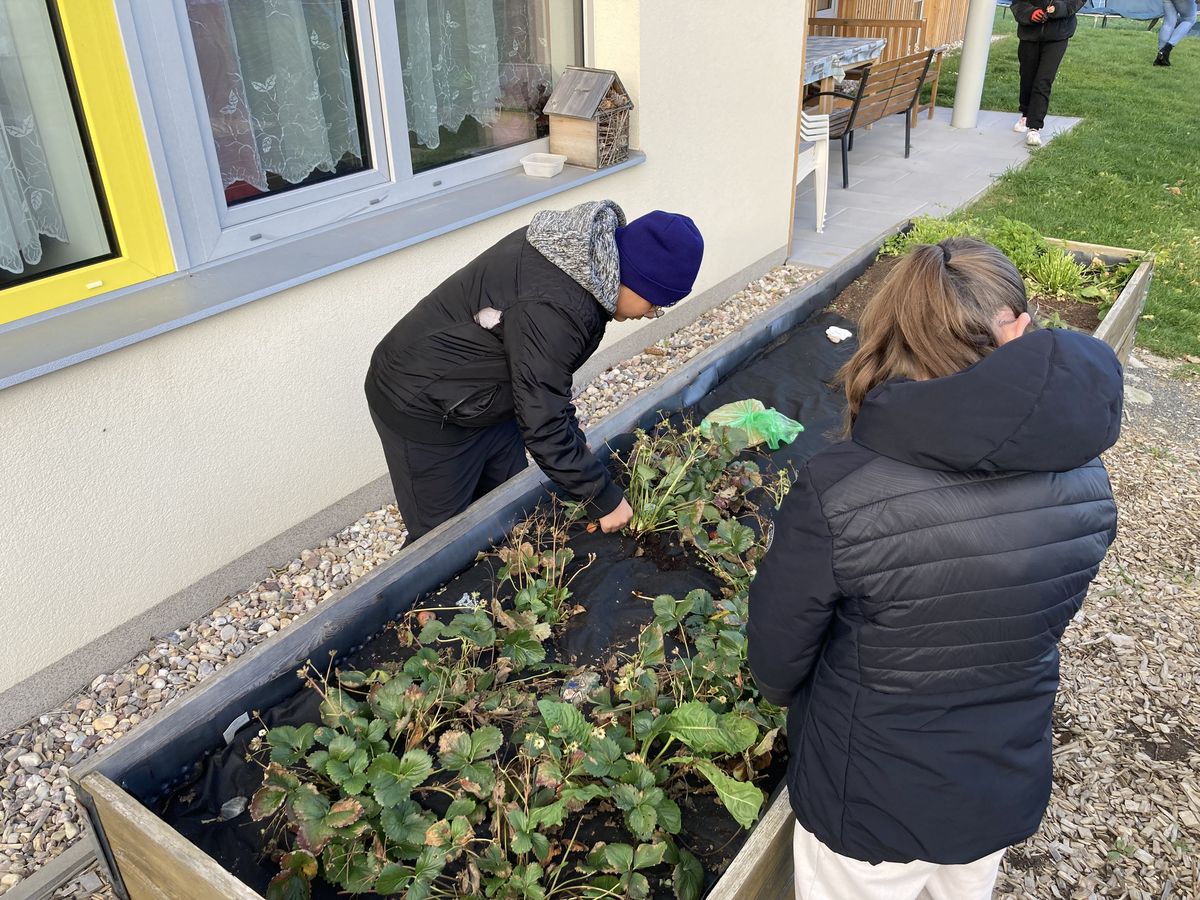 Přibližně ve čtyři hodiny odpoledne je čeká práce na zahradě. Rodinná skupina si tu pěstuje jahody, bylinky i rybíz. „O víkendech pečeme buchty, to děti hodně baví,“ s úsměvem podotýká pedagogická pracovnice Olga.