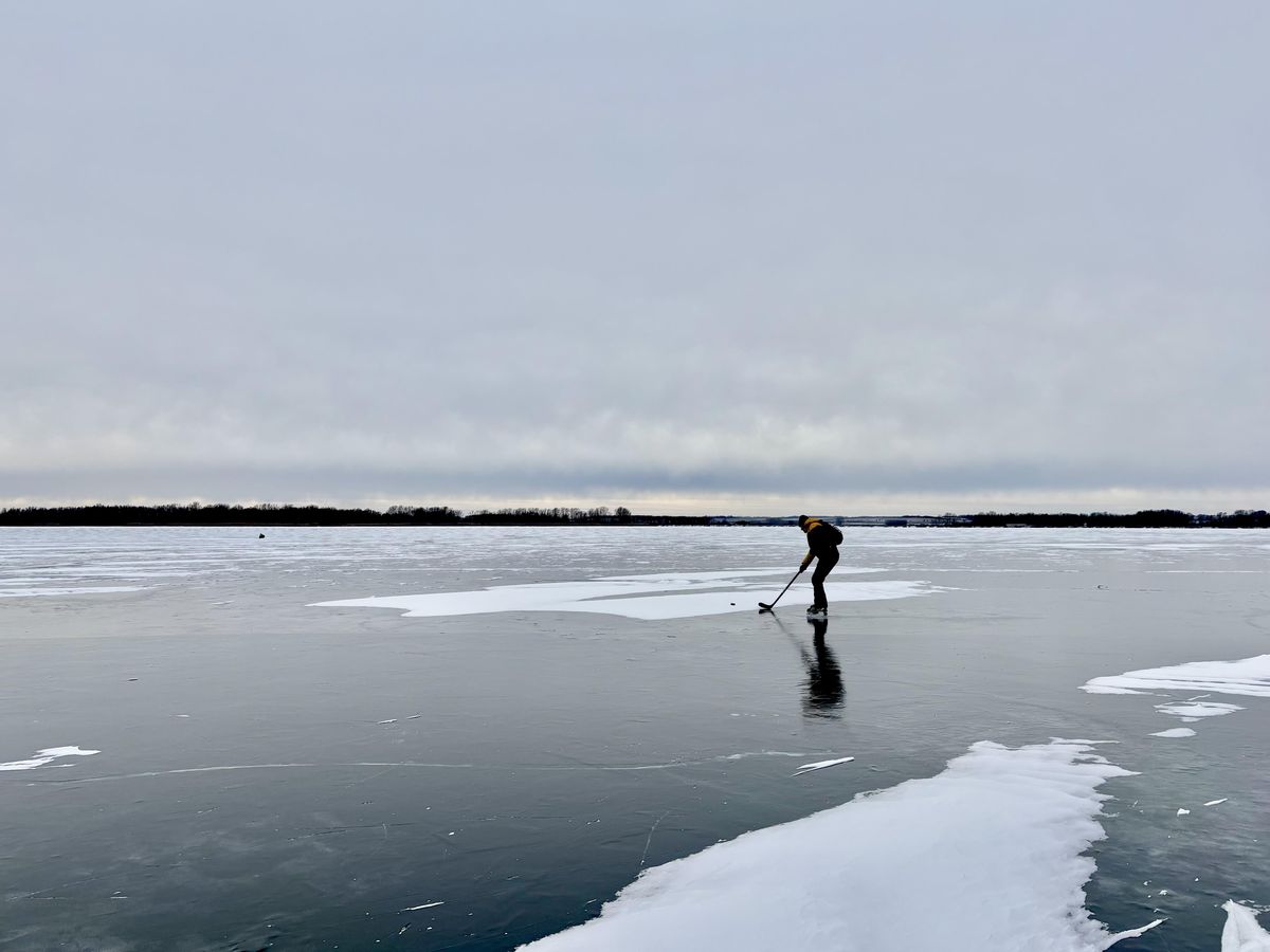 Hladina rozlehlého vodního díla se změní v silný led jen několikrát za desetiletí. Záběry průzračného ledu i nekonečně dlouhých ploch se o víkendu staly hitem sociálních sítí a přitáhly další zájemce. V pondělí dorazil s bruslemi taky Michal ze Žarošic na Brněnsku. „Nalákala mě ta velká plocha a kostel. U nás jsou jen malé rybníky, tak jsem chtěl zkusit něco většího,“ popsal.