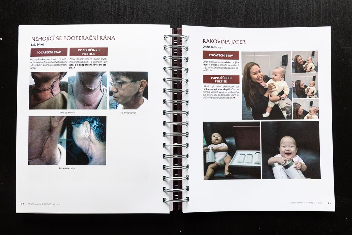 Josef ukazuje luxusně vypadající publikaci na lesklém křídovém papíru. Má 183 stran. Co strana, to lidský příběh se stejným vyústěním. Po užívání Purtieru následuje téměř zázračné zlepšení zdravotního stavu. Dětí i dospělých. Mladých i starých. Lehce i těžce nemocných. Dokonce i domácích zvířat.