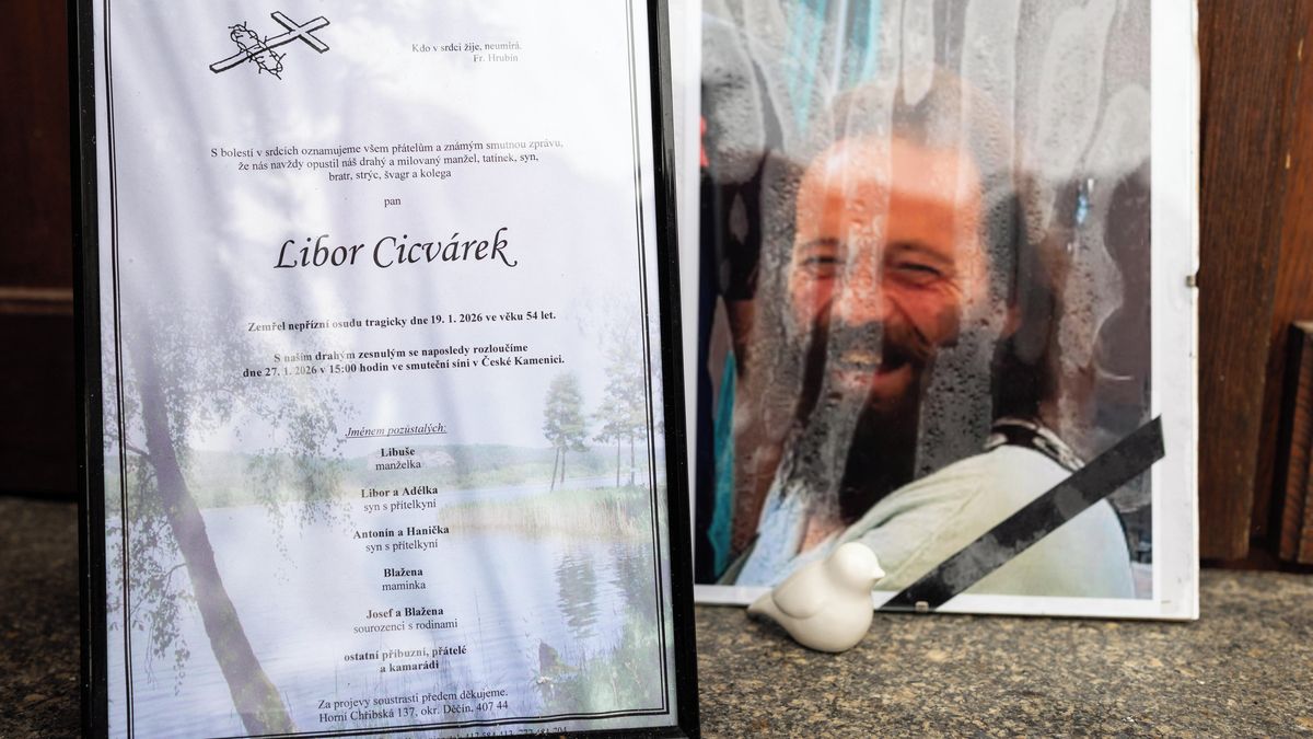 I po deseti dnech je v Chřibské na Děčínsku cítit bolest. Dveře městského úřadu jsou stále zavřené, nad nimi visí černá vlajka, na kterou v lednový čtvrtek dopadají vločky sněhu. Téměř všude kolem budovy se světlou fasádou leží věnce s černými stuhami, květiny i fotografie usměvavého muže s plnovousem - zastřeleného Libora Cicvárka.