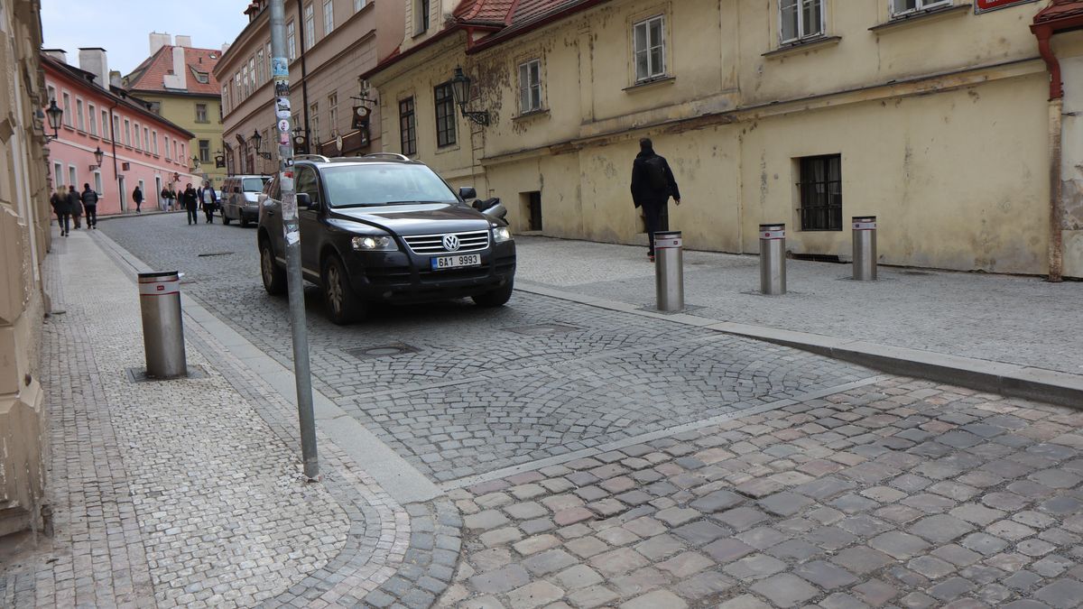 Adéla manévruje kočárkem, přes sloupek na chodníku se však dostane jen stěží – v nejužším místě zbyla průchozí mezera pouhých 70 centimetrů. Stejně jako většina ostatních lidí tak obchází překážku po vozovce vydlážděné velkými kamennými kostkami, která je v dotčeném místě vyrovnána do úrovně chodníku. Sloupky umístěné přímo na silnici jsou přitom, na rozdíl od těch chodníkových, zatím trvale zasunuté.