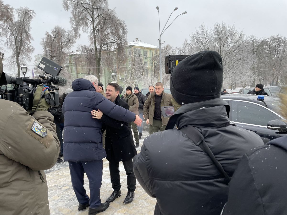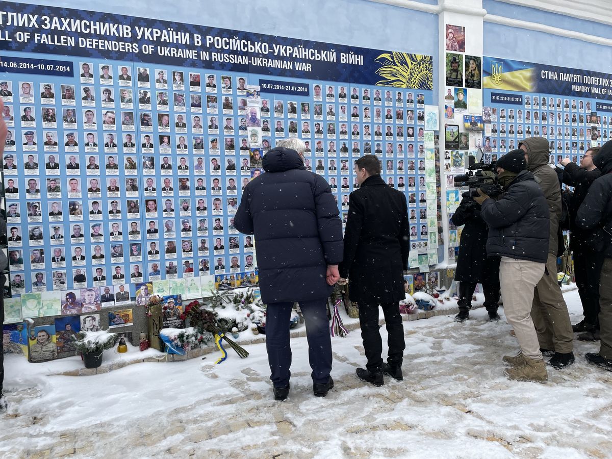 Petr Macinka se svým ukrajinským protějškem u Zdi padlých obránců Ukrajiny na Michajlovském náměstí v Kyjevě.
