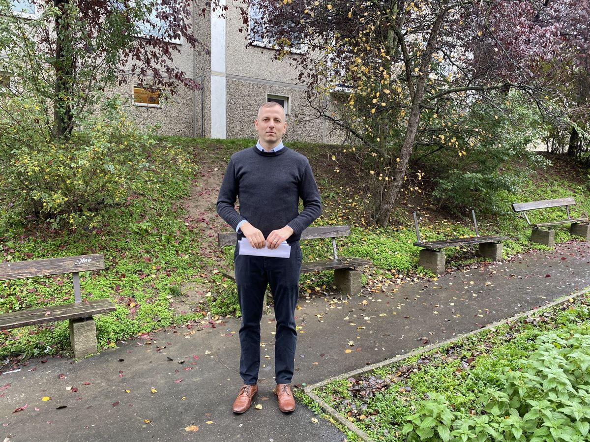 Lukáš Kaiser Zicha, opoziční zastupitel na Praze 4 za STAN, který na problém v domu narazil, když se v létě ptal náhodných lidí, jak se jim žije. Teď upozorňuje třeba i na rozpadlé lavičky u domu.