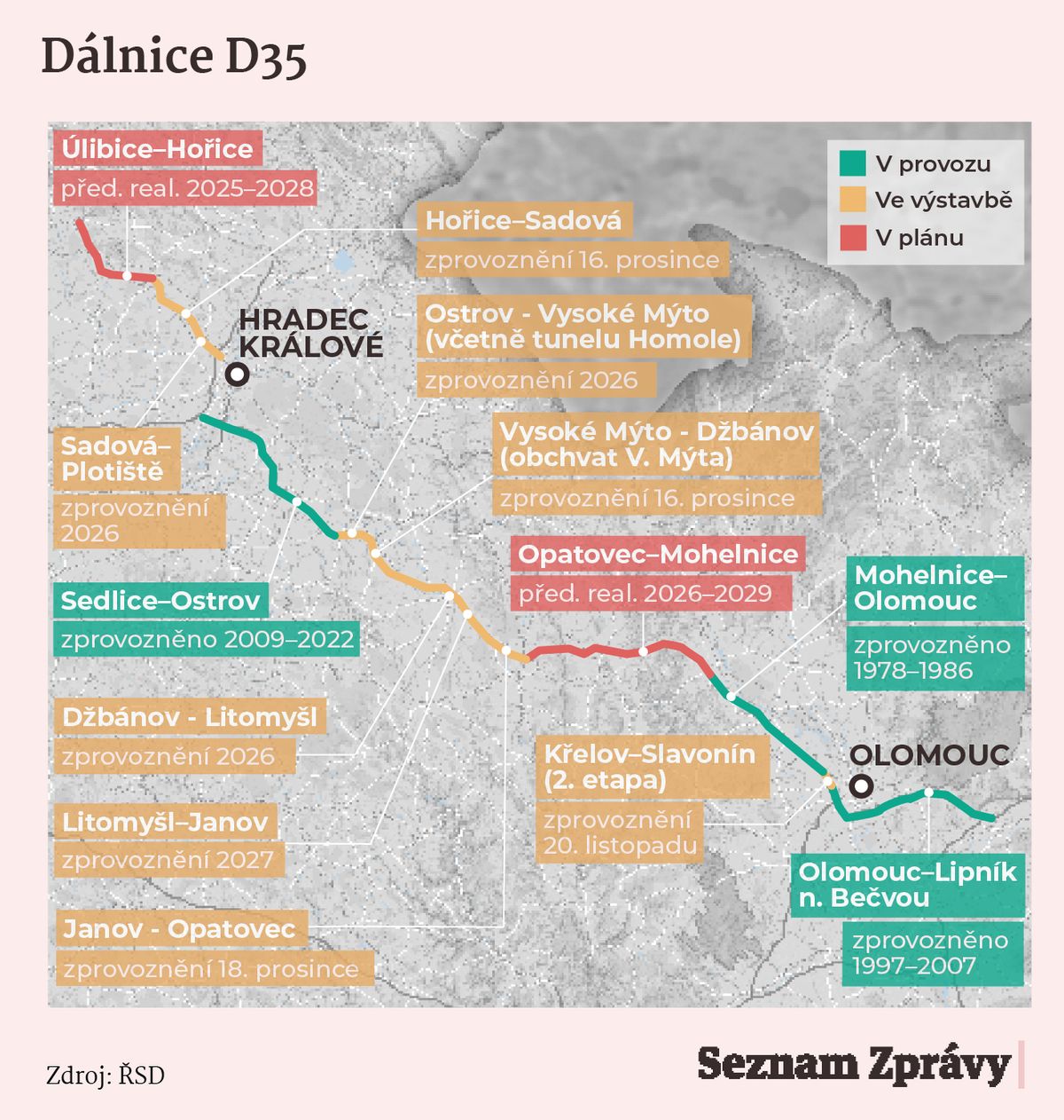 Velké úlevy se po letech dopravní trýzně dočkají u Vysokého Mýta nebo Olomouce. Silničáři tam ještě před Vánoci kompletně zprovozní další úseky dálnice D35. Propojení Hradce Králové s Olomoucí má v budoucnu ulevit přetížené D1. Po svém dokončení bude D35 měřit 210 kilometrů a stane se druhou nejdelší dálnicí v Česku.