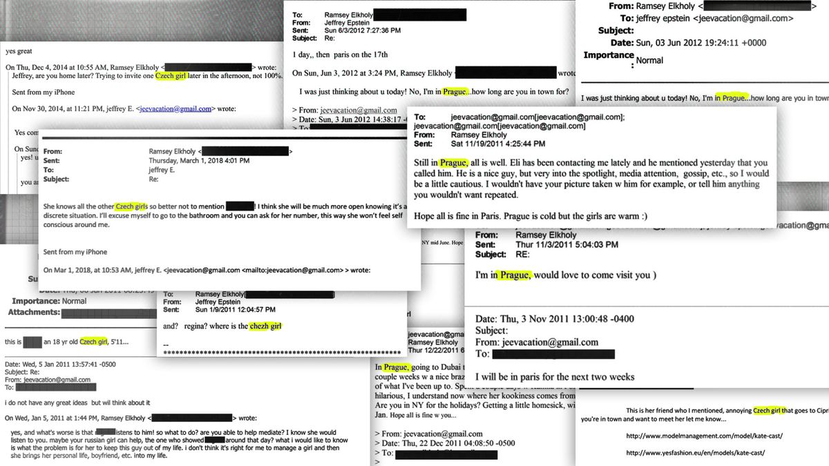 Dotčená komunikace mezi Epsteinem a Elkholym pochází z let 2009 až 2019. A je z ní zjevné, že Elkholy pro něj vyhledával dívky nejprve ve Spojených státech, později létal po celém světě. Soustředil se však zejména na střední a východní Evropu, Rusko nebo Ukrajinu. Prahu přitom navštívil minimálně desetkrát. A čile ze svých „náborových“ cest Epsteinovi psal.