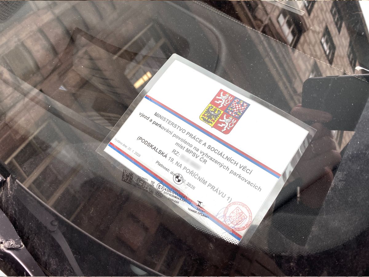 Ono úterý si na parkování bílého SUV stěžovala a oznámila přestupek i na policii, v dalších dnech přibyla za čelním sklem vozu kartička povolující parkování na vyhrazených místech určených pro Ministerstvo práce a sociálních věcí.
