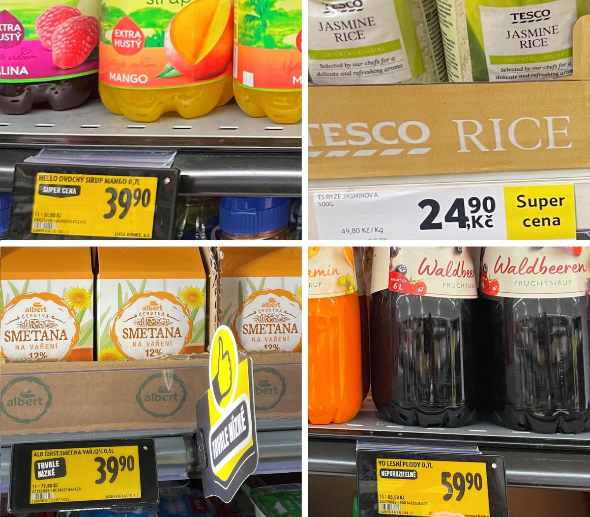 Společnost Tesco ještě zkraje roku 2025 uplatňovala mnohem jednodušší podobu cenovek. Nabízela klasické slevy s uvedením původní ceny a také slevy pro členy svého věrnostního programu Clubcard. Koncem roku řetězec začal používat označení „super cena“, ale z popisu na etiketách není jasné, proč má být tato cena výhodná. Cenovou historii neuvádí ani u dalšího nového označení „vždy levně“.