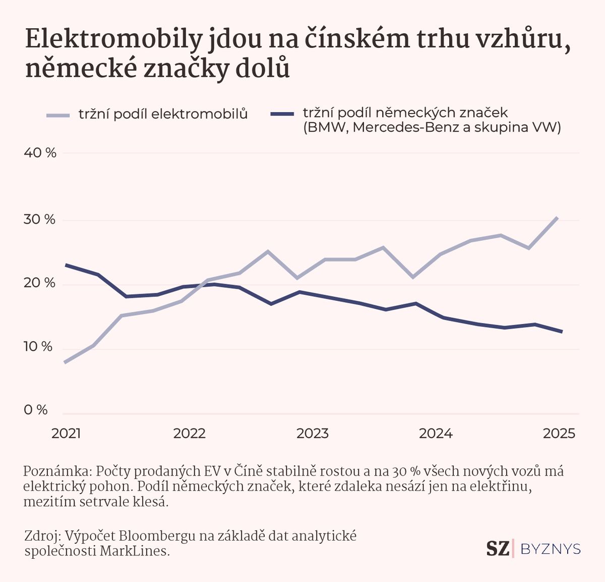 V Evropě zatím pořád věří v přechod k elektromobilitě a jejich prodeje rostou pomaleji. I tak ale získaly asi už pět procent místního trhu a křivky jejich prodejů dál míří vzhůru. Tedy přesně tím směrem, který by manažeři německých koncernů uvítali u interních grafů z Číny.