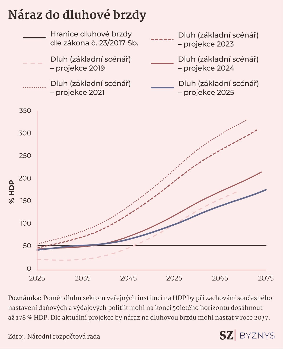 Za nepříznivým výhledem stojí kombinace faktorů. Vedle trvalých schodků běžného hospodaření hrají zásadní roli rostoucí výdaje na obranu, které mají dosáhnout 3 % HDP do roku 2030. Demografické stárnutí navíc vyvolá tlak nejen na penzijní systém, ale také na zdravotnictví, jehož výdaje podle odhadů Národní rozpočtové rady vzrostou ze současných 6,4 na 7,7 procenta HDP do roku 2075.