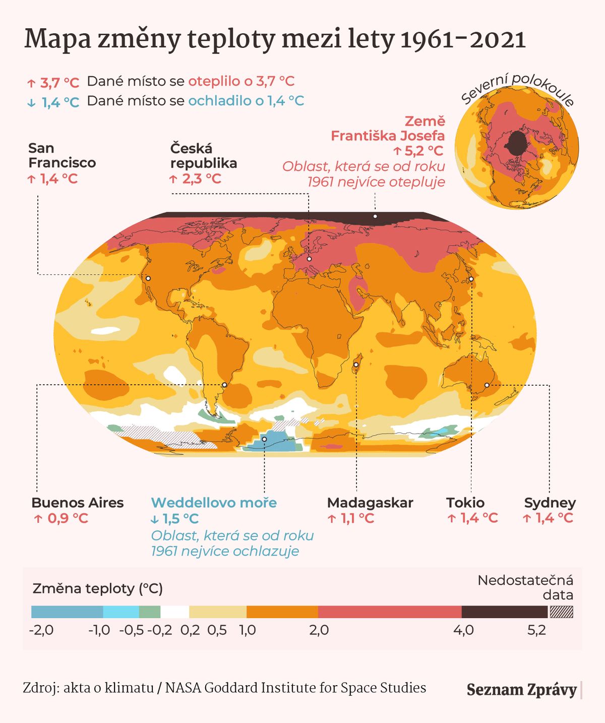 Mapa změny teploty mezi lety 1961-2021