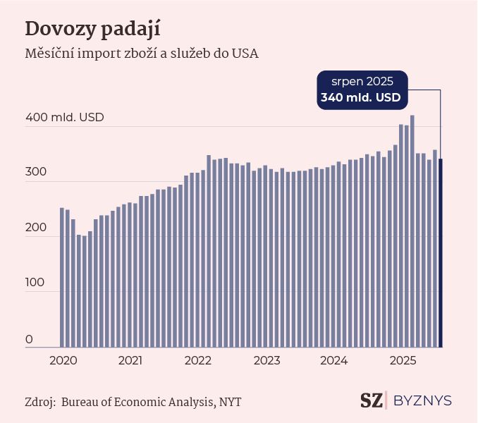 Letos v srpnu zavedená Trumpova cla už způsobila propad dovozu zboží a služeb do USA. Podle čerstvých dat zveřejněných v listopadu klesl dovoz o 5,1 procenta na 340,4 miliardy dolarů. Efektivní celní sazba USA se vyšplhala na více než 18 procent, což je podle Budget Lab na Yale University nejvyšší úroveň od roku 1934.
