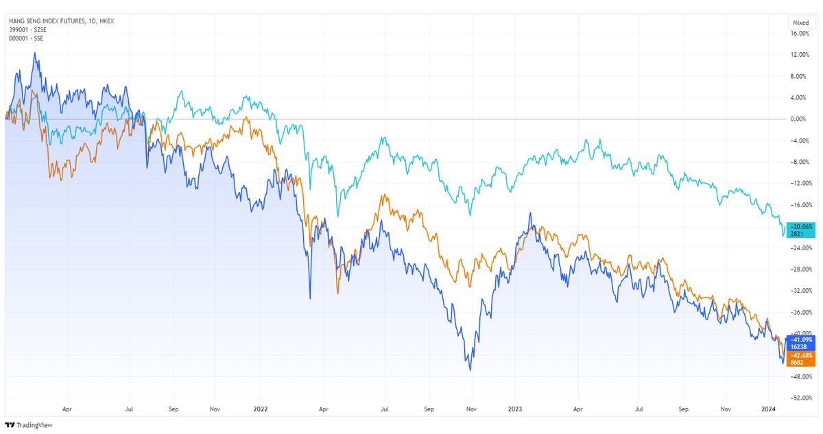 Čínské akcie od roku 2021 čelí hlubokým propadům. Z hlavních indexů si vedou nejhůře hongkongský Hang Seng (modrá křivka) a čínský Shenzhen (oranžová křivka). Oba indexy od prvních měsíců roku 2021 odepisují přes 40 procent. Shanghai Composite pak ztrácí zhruba pětinu. Akciím má pomoci vládní balíček ve výši dvou biliónů jüanů.