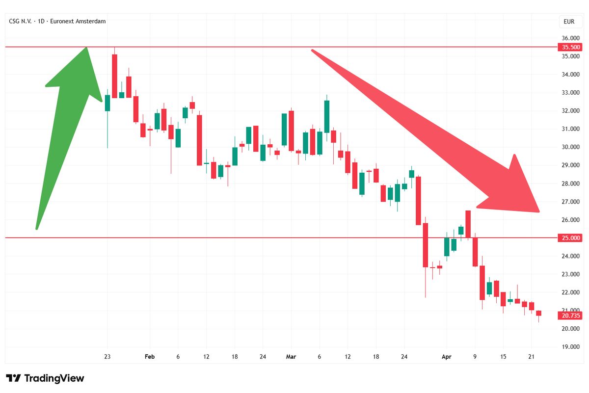 Titul CSG po debutu na burze nejprve výrazně rostl a z emisních 25 eur se dostal až k hranici 35,5 eura. Poté ale přišla otočka a akcie se v dubnu obchodují pod emisní cenou.