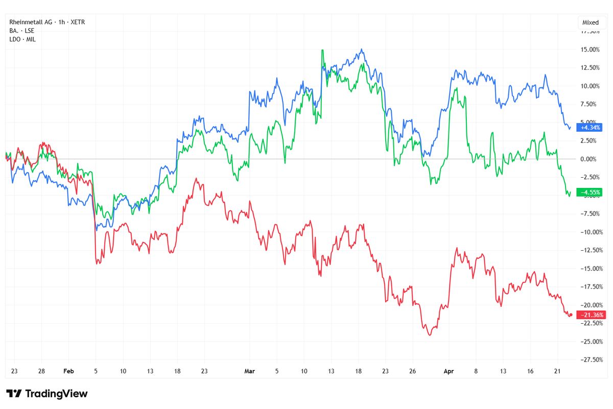 Německý Rheinmetall od ruské invaze na Ukrajinu vzrostl přibližně desetinásobně, britský BAE Systems od roku 2022 více než ztrojnásobil svou hodnotu a o stovky procent posílilo také italské Leonardo. Na jaře ale některé z těchto titulů část předchozích zisků odevzdaly.