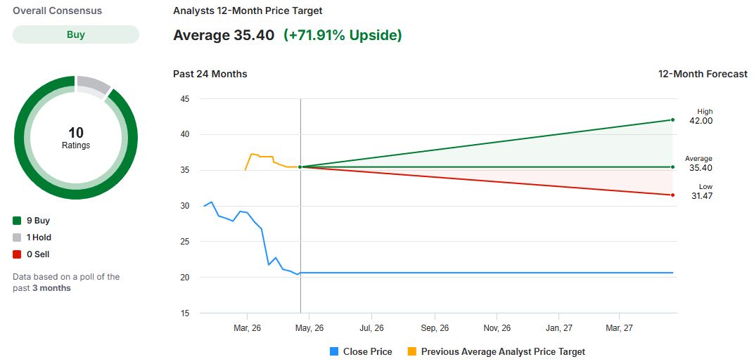 Další banky, jako BNP Paribas, Jefferies, JPMorgan nebo Kepler Cheuvreux, stanovily cílové ceny zhruba v rozmezí 34 až 40 eur. Průměrná cílová cena podle konsenzu deseti analytiků činí 35,4 eura za akcii, což při současné ceně kolem 21 eur znamená potenciál růstu zhruba o 72 procent.