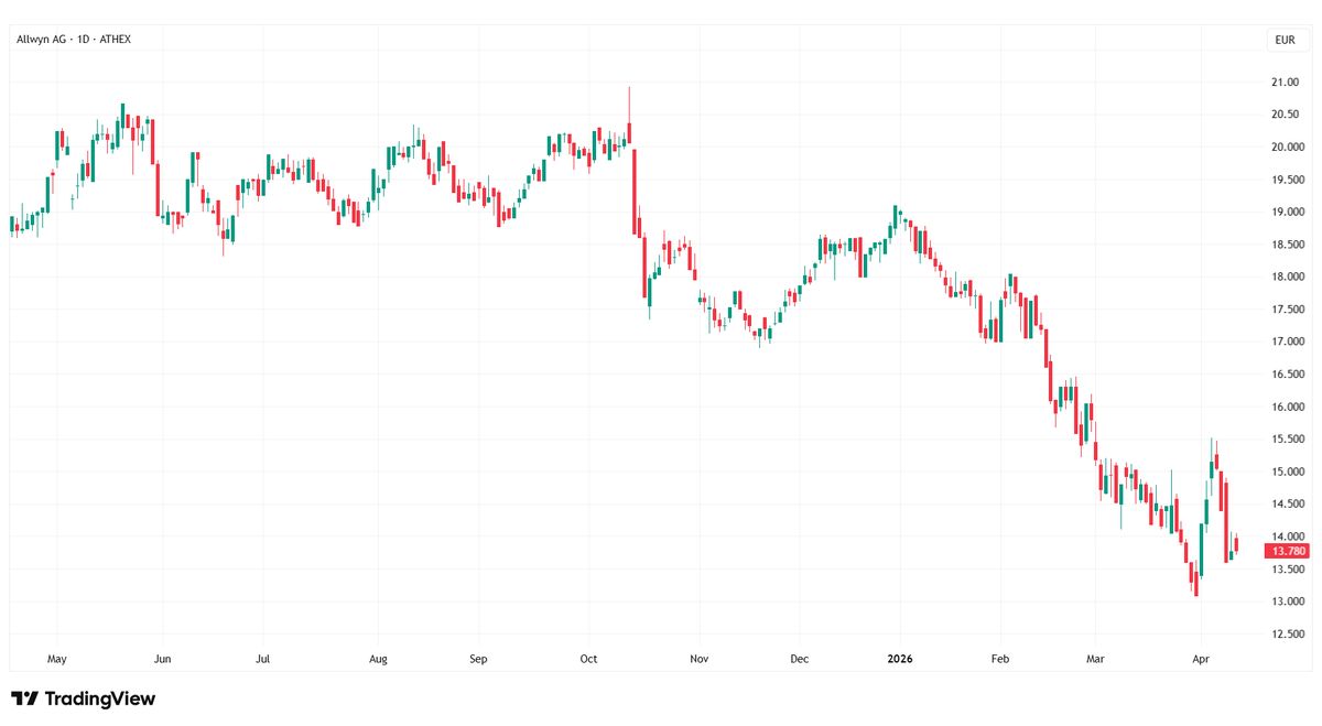 Vývoj akcií Allwynu na athénské burze za posledních 12 měsíců. Od začátku roku titul ztrácí přibližně čtvrtinu hodnoty.