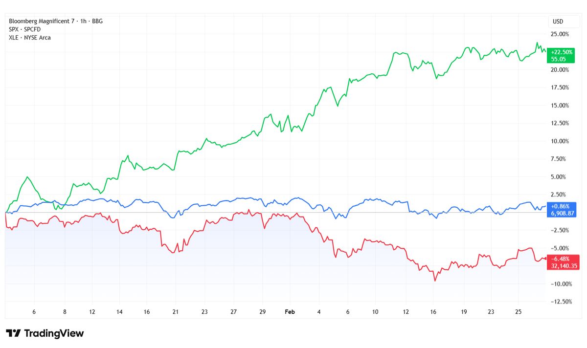 Letošní vývoj ukazuje rozdíly v jednotlivých částech trhu. Velká sedmička (červená křivka) je od začátku ledna v mínusu, zatímco širší index S&P 500 (modrá křivka) zůstává kolem nuly. Naopak energetický sektor (zelená křivka) výrazně roste, což ilustruje přesun kapitálu mimo technologické giganty.