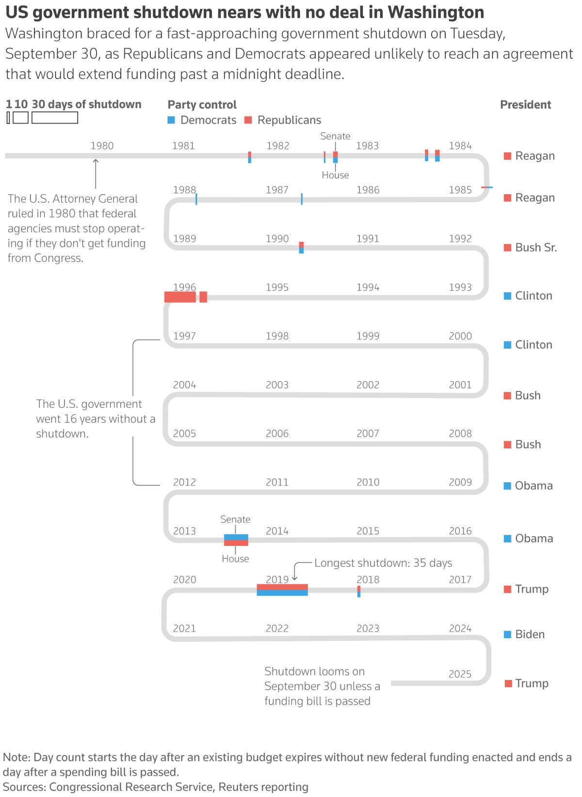 Přehled vládních shutdownů v USA od roku 1980. Graf od agentury Reuters ukazuje, kdy k nim došlo, která strana měla většinu v Kongresu a kdo byl prezidentem. Nejdelší výpadek nastal za Donalda Trumpa na přelomu let 2018 a 2019 a trval 35 dní.