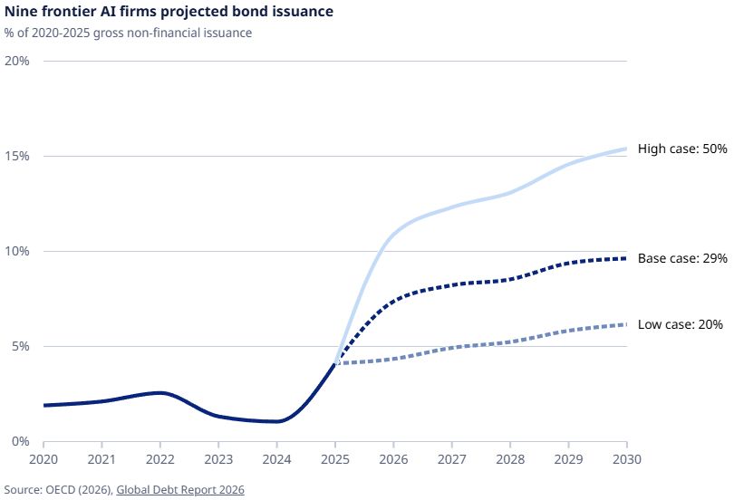 Podle OECD se z technologických gigantů mohou stát stále významnější emitenti dluhopisů, protože už si nevystačí jen s vlastní hotovostí a ve větší míře se obracejí na externí financování. Důvodem je mimořádně nákladná expanze spojená s rozvojem umělé inteligence, zejména budování a rozšiřování datových center.