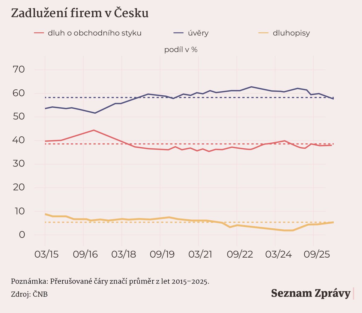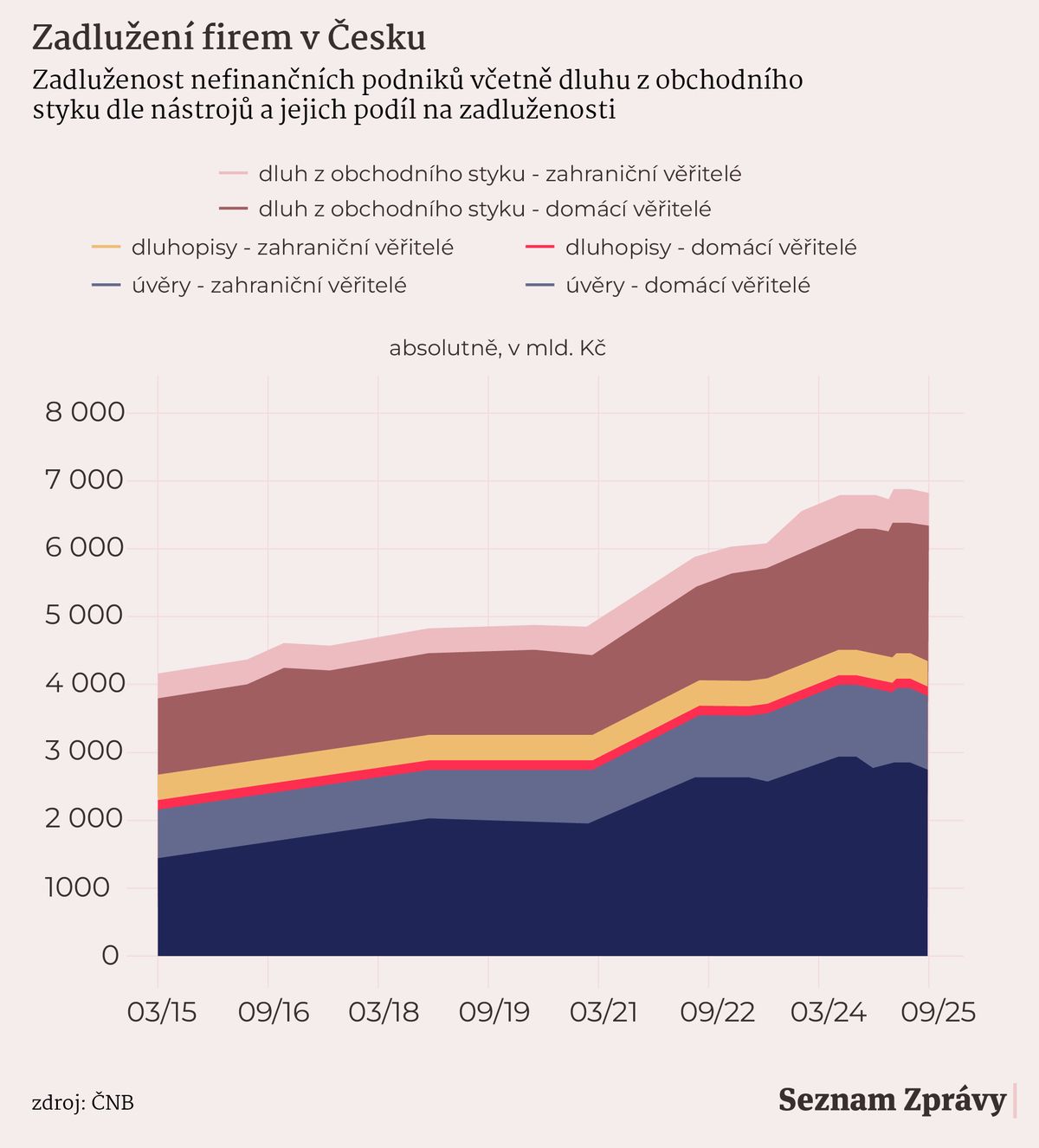 Celkový dluh tuzemských firem (čili nefinančních podniků) dosáhl ke třetímu čtvrtletí roku 2025 přes sedm bilionů korun. Z toho čtyři biliony korun tvoří klasické úvěry od bank, dalších 2,6 bilionu je dluh z obchodního styku, tedy hlavně nezaplacené faktury, a zbytek připadá na dluhopisy.