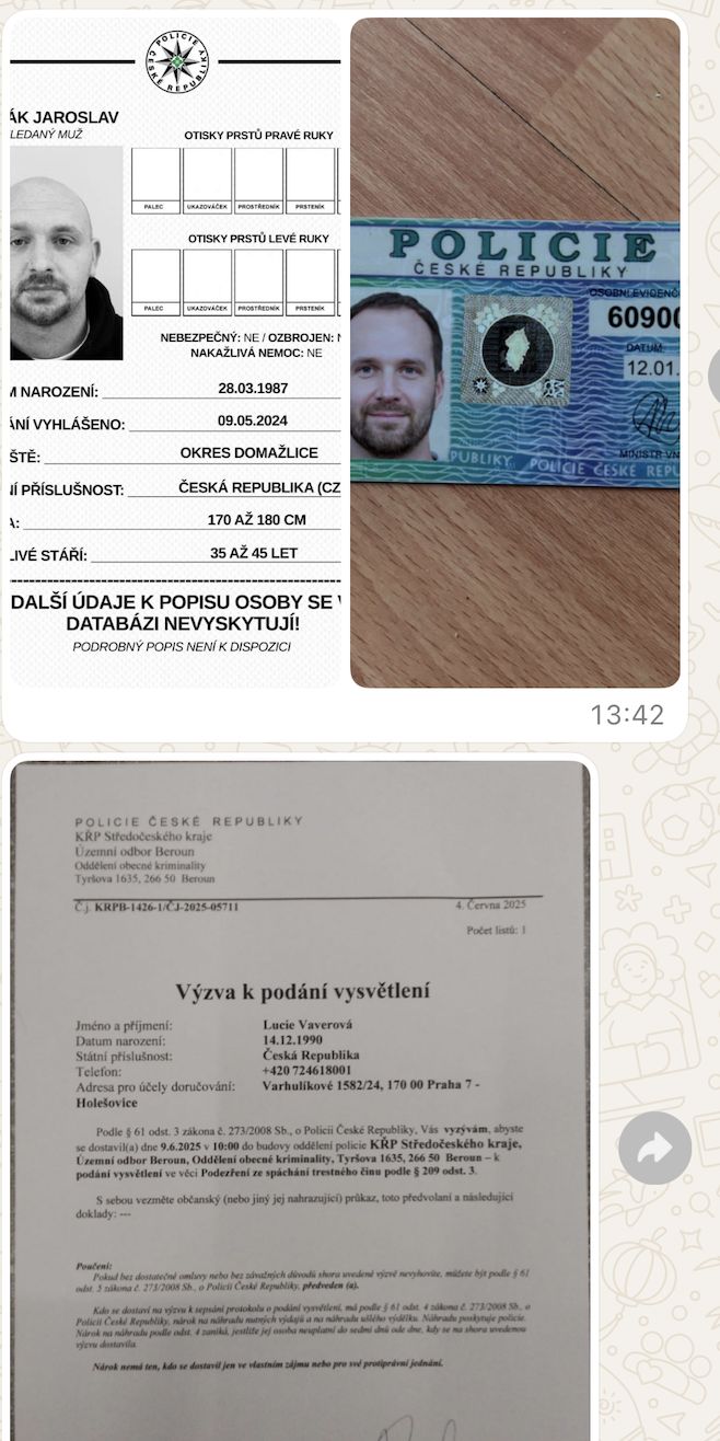 Typicky pak následuje falešné předvolání k výslechu. „Chtěli po mně adresu, datum narození pro ověření a poté mi přišel dokument k předvolání v Kadani,“ píše pan Petr. Pak podvodníci posilují svou story dalším telefonátem, tentokrát od „pracovníka České národní banky“. Přestože se údajný pracovník ČNB Tomáš Valenta také legitimuje zfalšovaným průkazem pracovníka ČNB přes WhatsApp, klient Petr už začíná mít podezření.