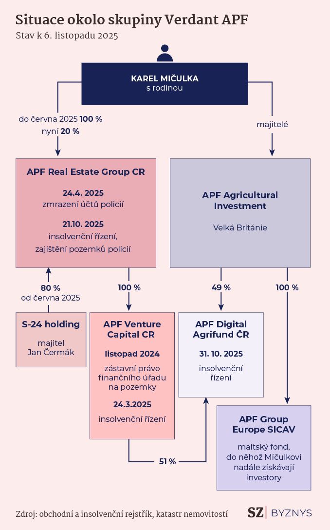 Skupinu Verdant APF řídila a vlastnila rodina podnikatele Karla Mičulky. Holding od loňska čelil finančním potížím, které vyvrcholily letos. Na pokraji bankrotu Mičulkovi v červnu postoupili většinový podíl v klíčové společnosti ze skupiny firmě S-24 holding obchodníka s pohledávkami Jana Čermáka.