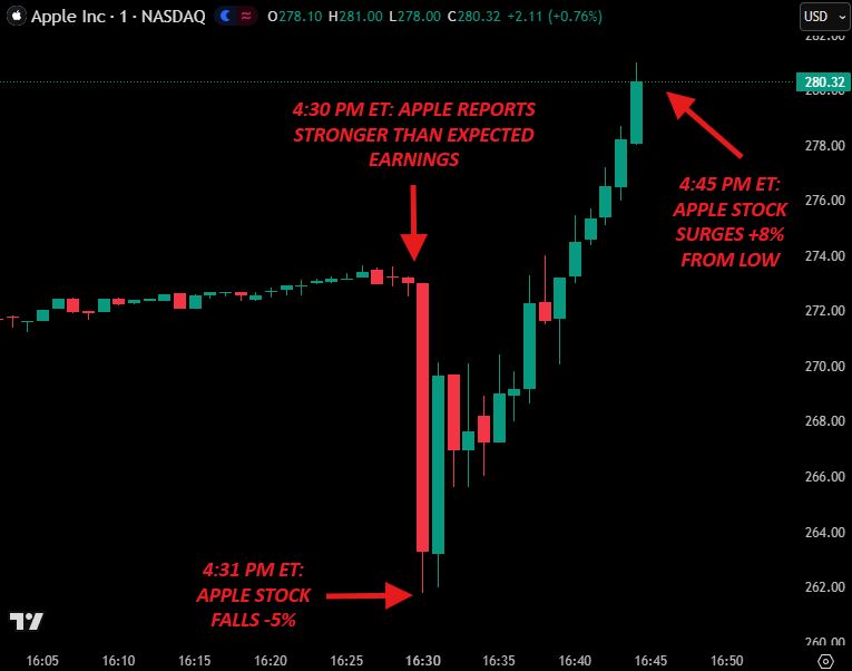 Po uzavření burzy se obchoduje s menším objemem a v prostředí nižší likvidity mohou být pohyby ještě prudší. Když se do hry zapojí počítačové algoritmy, které automaticky reagují na každou novou zprávu, cena akcií dokáže během pár minut vystřelit nahoru nebo prudce spadnout. Apple to tentokrát zažil doslova v přímém přenosu.