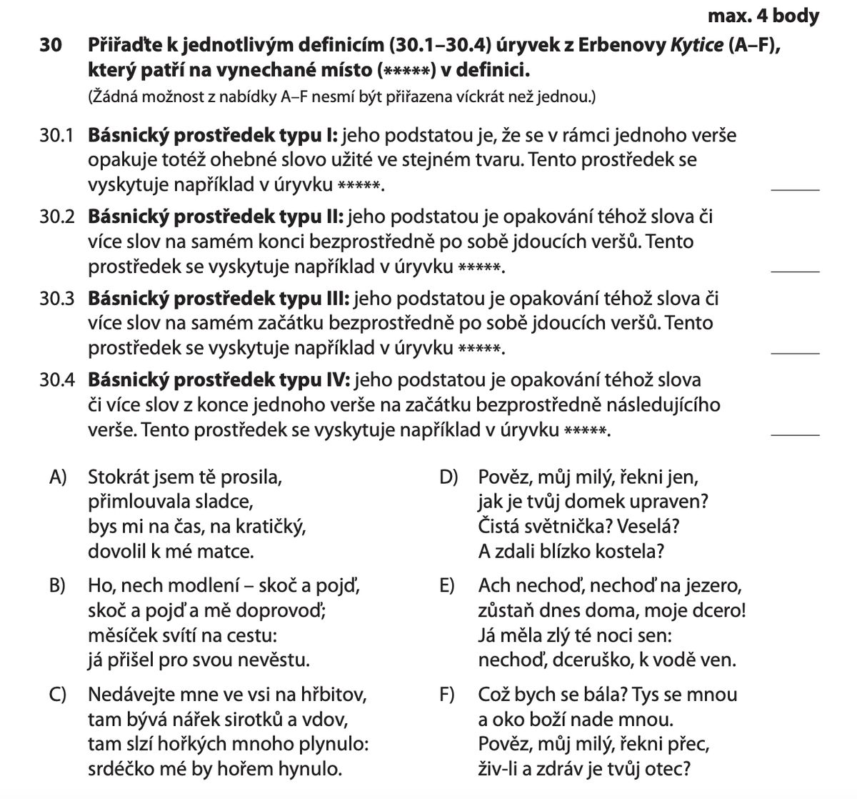 V poslední úloze z češtiny měli žáci k jednotlivým definicím přiřazovat úryvek z básnické sbírky Kytice Karla Jaromíra Erbena. Na zadání se můžete podívat v obrázku níže a v popisku najdete opět i správné odpovědi.