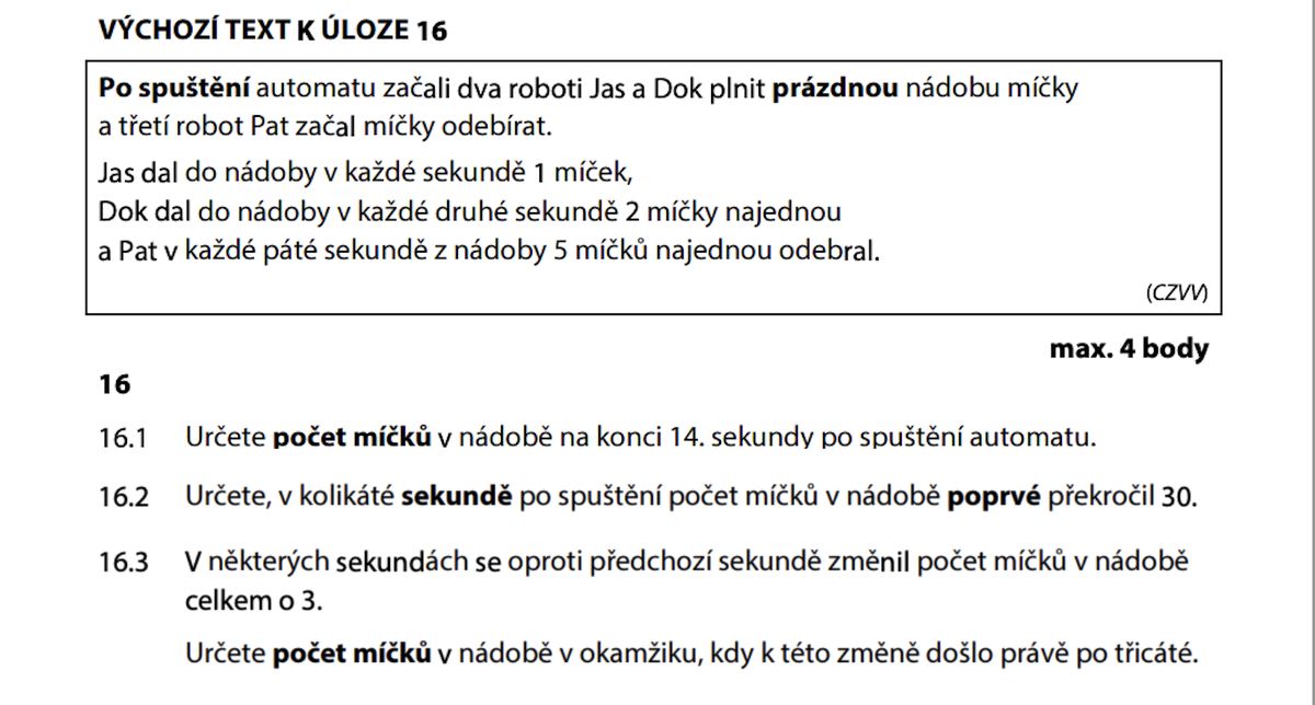 ŘEŠENÍ: 16.1 – 18 míčků, 16.2 – ve 28. sekundě, 16.3 – 78 míčků.