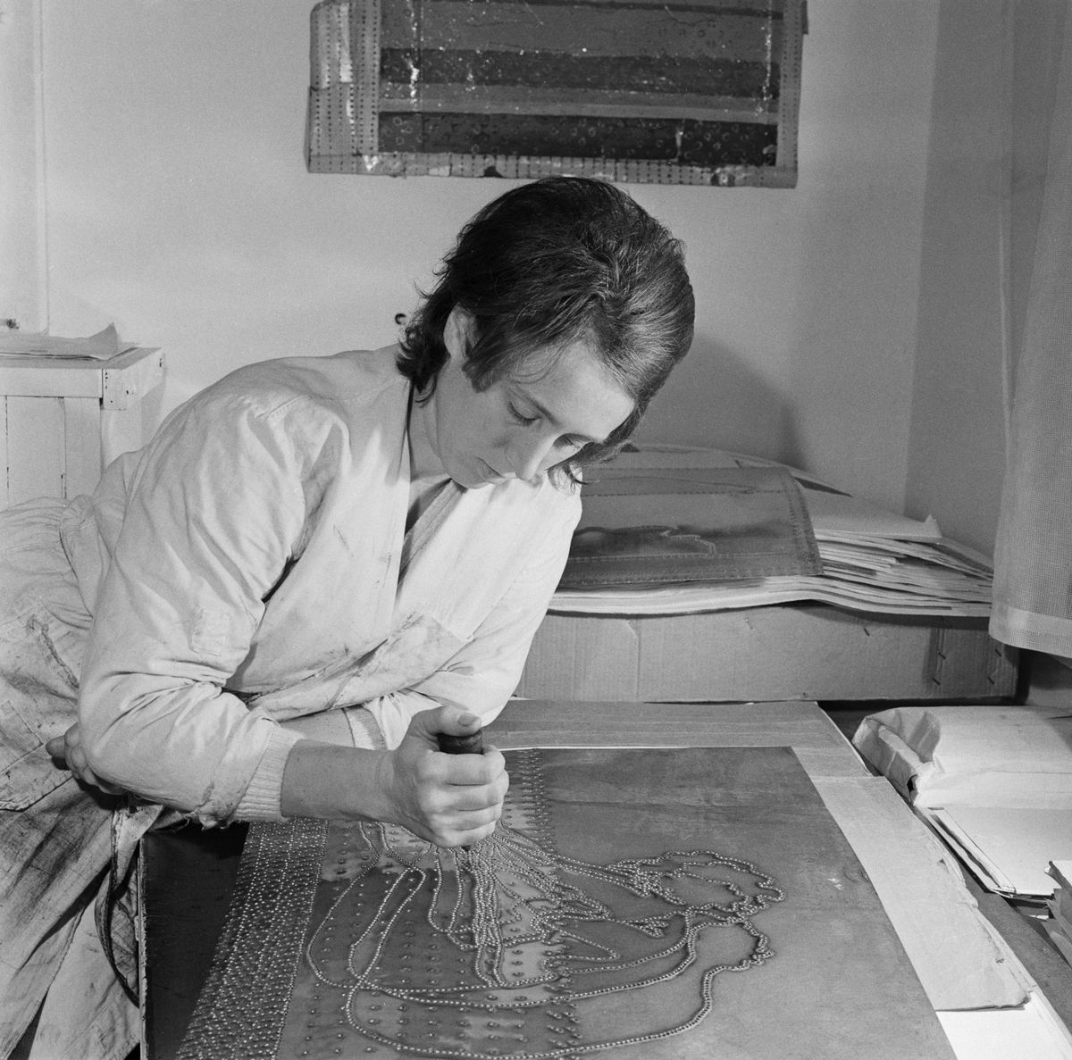Alena Kučerová (na fotografii z roku 1967) perforuje matrici pro tisk grafiky.