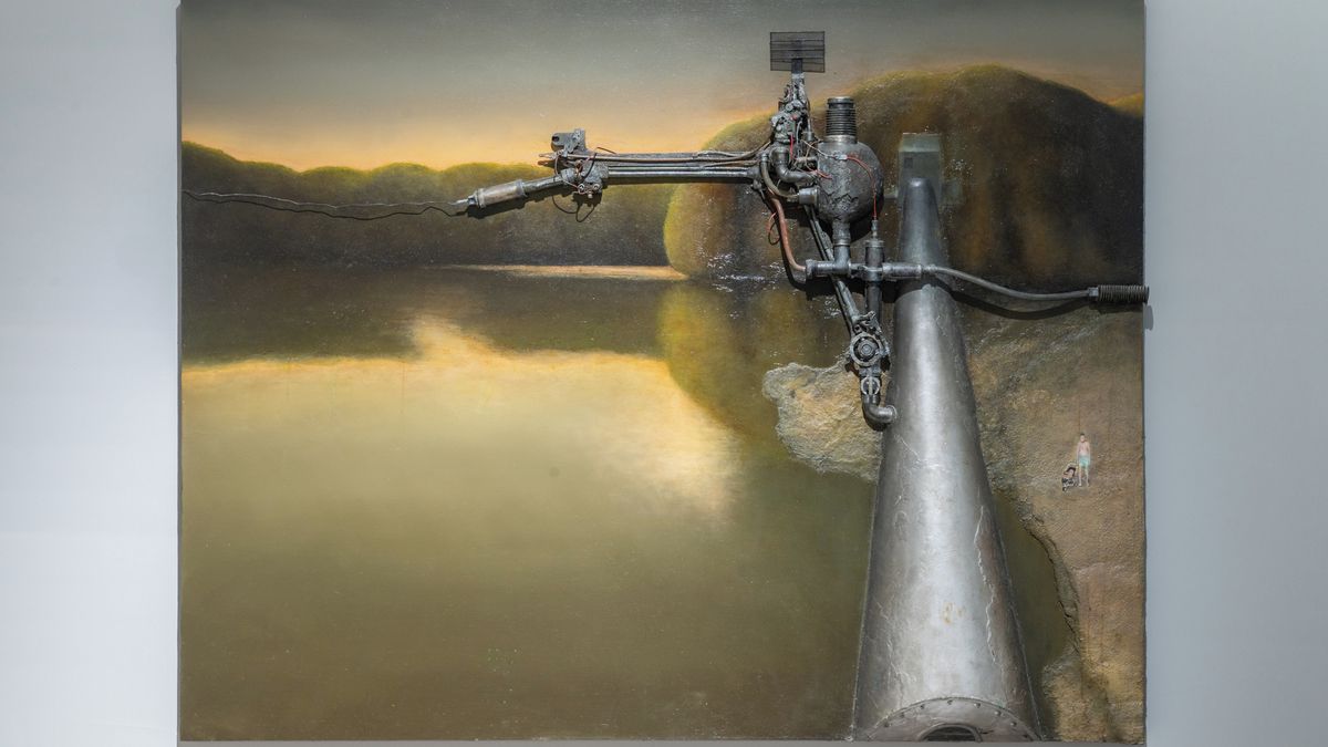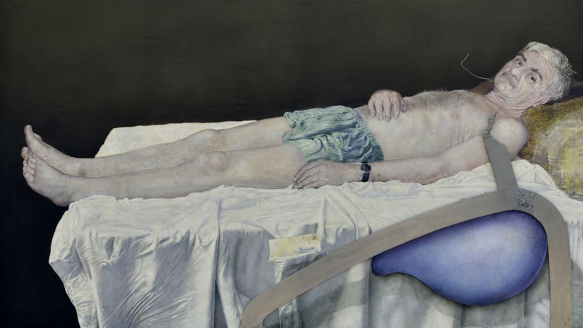 Bedřich Dlouhý „kontruje“ jiným figurálním motivem, zakončeným jako asambláž. Je to známý, hyperrealistický autoportrét, na kterém polonahý autor leží na pomačkaném prostěradle, od ramene ale vystupuje před plátno jakýsi kovový objekt. Jiný obraz nazvaný Starý pivovar spojuje snovou krajinu s rybníkem a kovovým mechanismem domácí výroby.