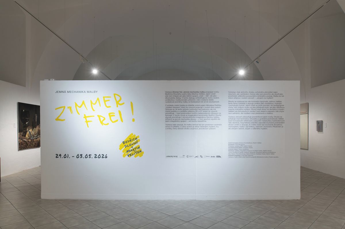Všechny tři práce, technicky virtuózní, navíc vtipné a spojující malbu s konceptem, nyní vystavuje Galerie Roudnice. Pod názvem Zimmer Frei představuje díla někdejšího žáka Velíška a jeho nedávno zesnulého profesora Dlouhého. Pomyslný dialog generačně rozdílných, ale smýšlením si blízkých tvůrců je v Roudnici nad Labem k vidění do 3. května.