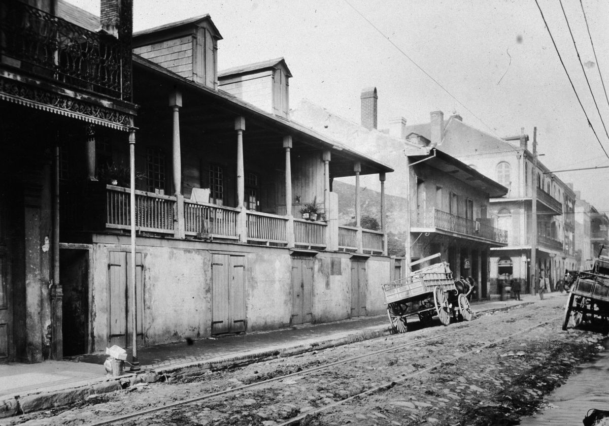 Historická budova ve francouzské čtvrti v New Orleans zvaná Madame John's Legacy. Uvnitř se natáčela mimo jiné část oscarového filmu 12 let v řetězech. Fotografie pochází zhruba z roku 1900.