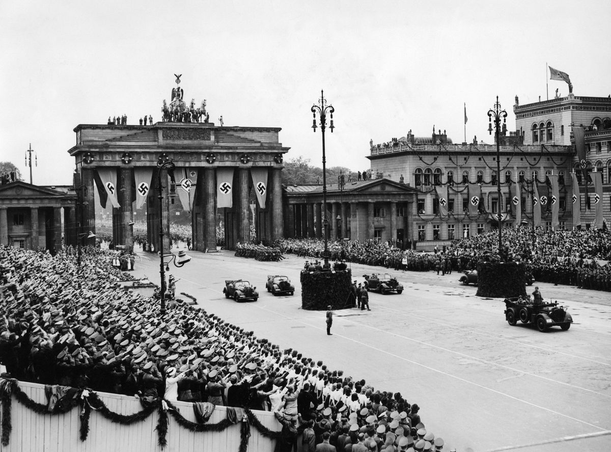 Pabsta v Berlíně vítají vojenské průvody a hákové kříže. Ilustrační fotografie z roku 1940.
