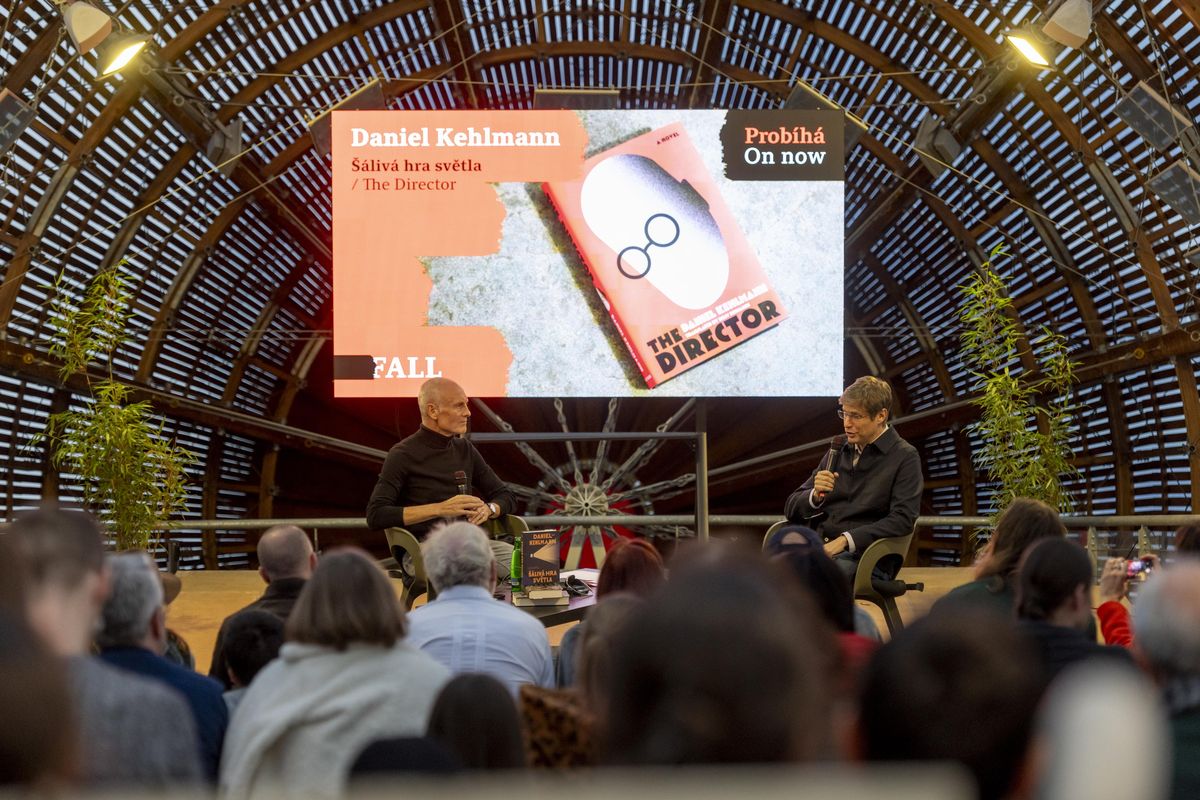 Daniel Kehlmann (vpravo) svůj román představil na festivalu Fall v pražském Centru současného umění DOX. Debatu s ním moderoval Petr Vizina.