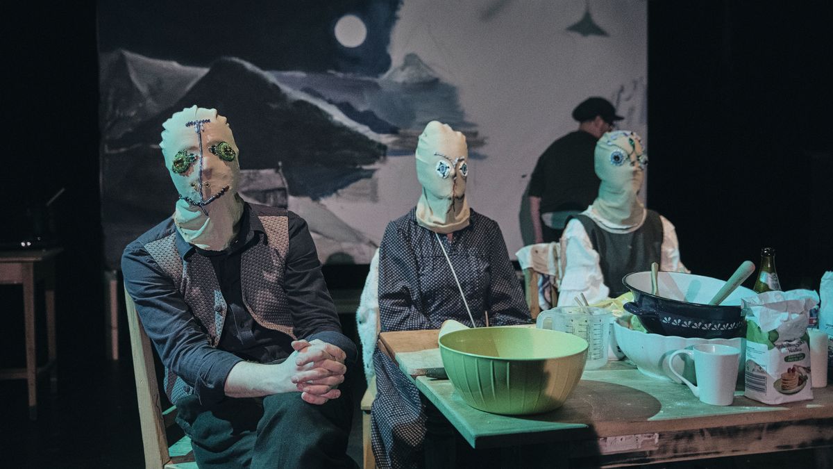 V jedné části inscenace si herci nasazují masky. Na fotografii jsou Tomáš Havlínek, Lucie Trmíková a Denisa Barešová.