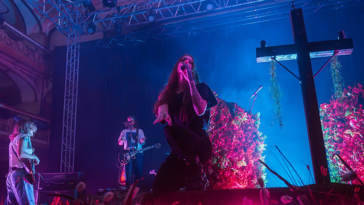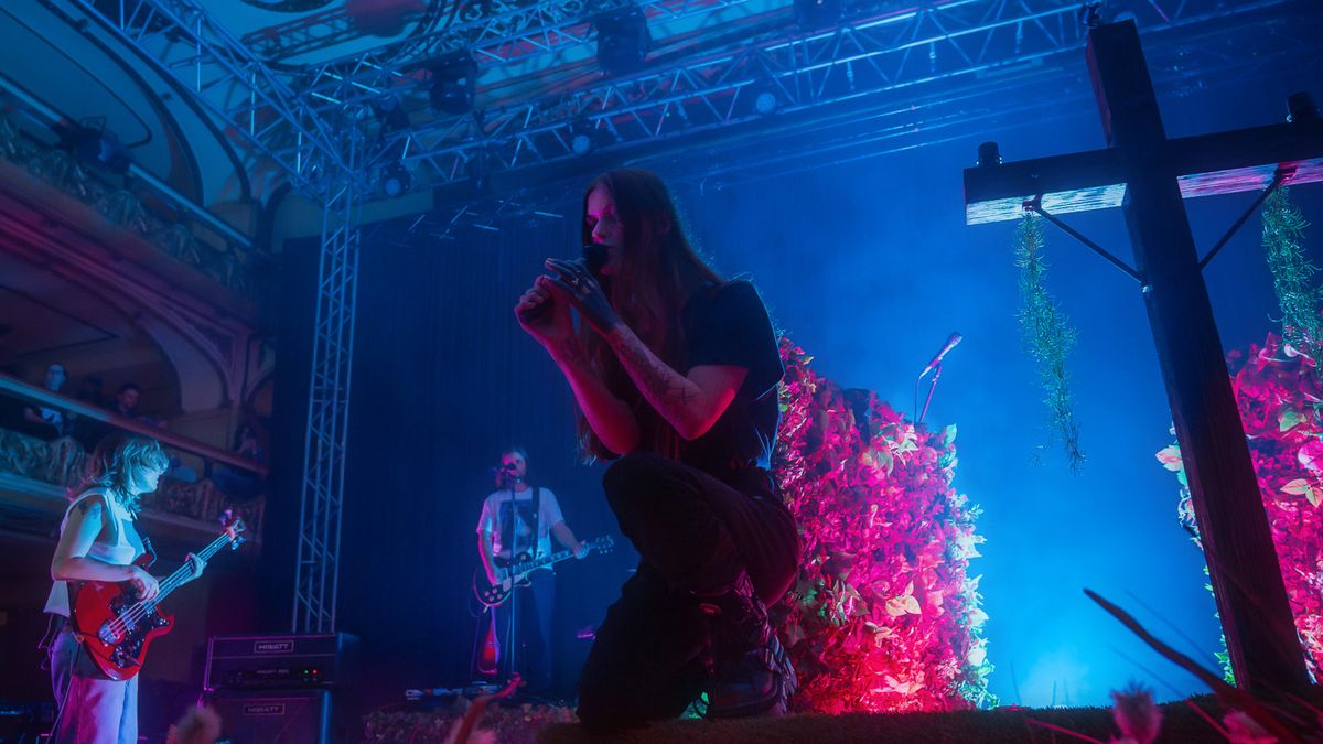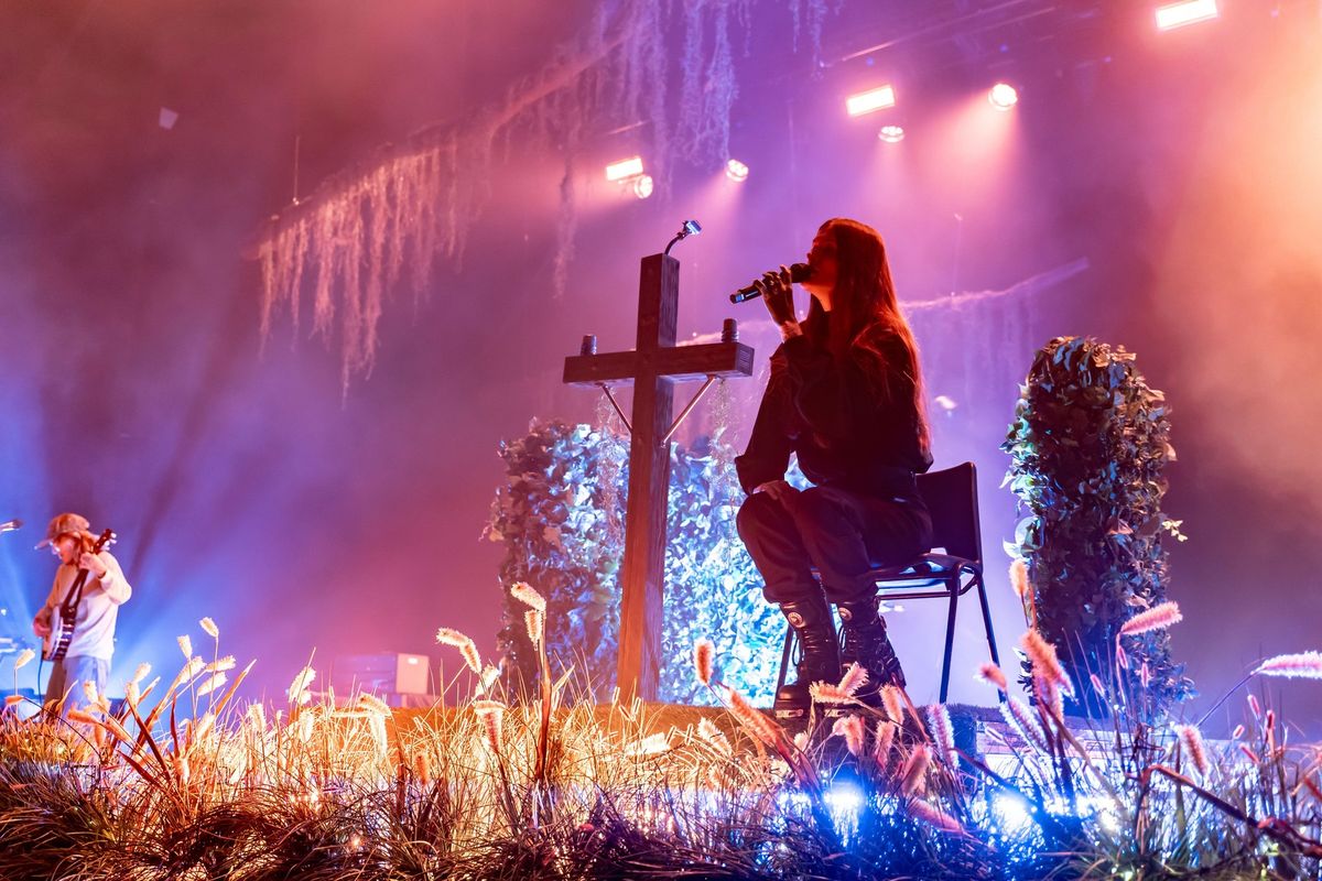 Ethel Cain je uprostřed jeviště sama. S tváří lemovanou dlouhými tmavými vlasy, v obyčejném černém tričku a širokých kalhotách stojí za klávesami a stojanem na mikrofon ve tvaru obrovského kříže. Obklopují ji pohřebně naaranžované květiny.
