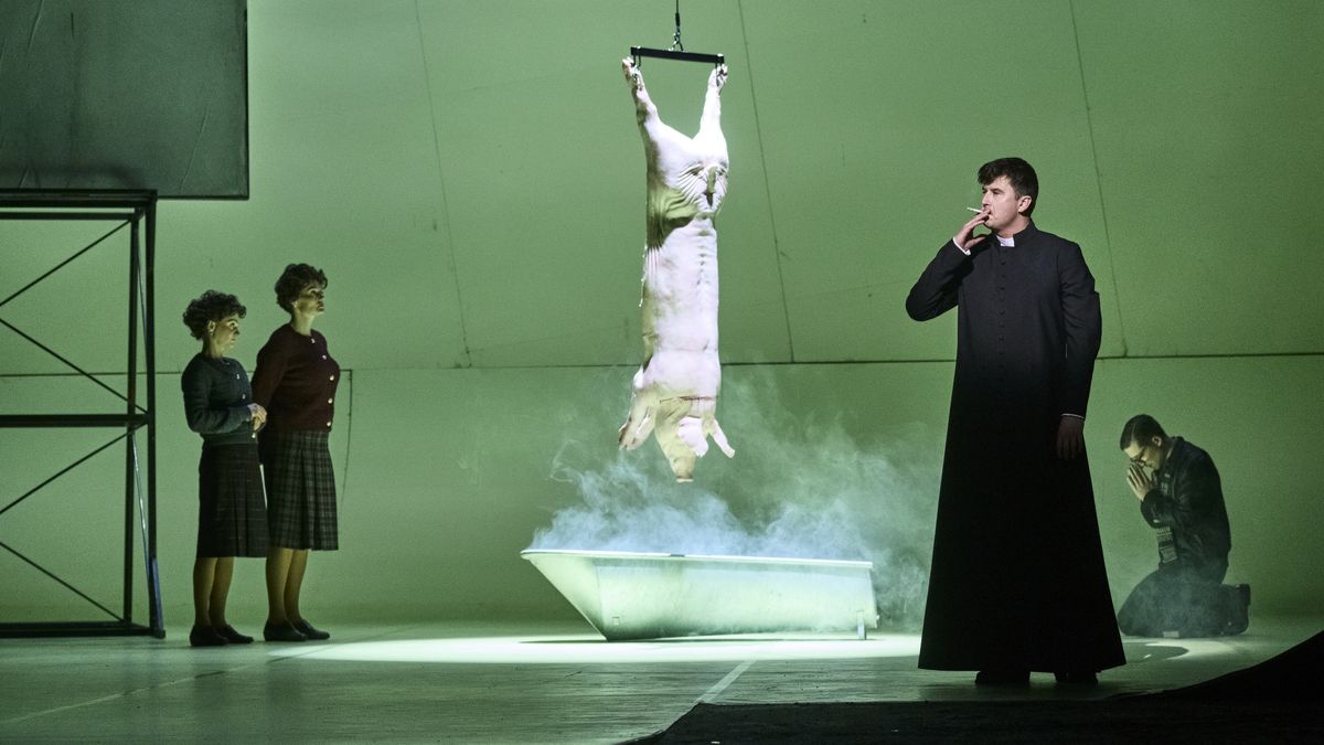 Jeden z nejmrazivějších výjevů přichází v sedmé kapitole, uvozené jako disputace o dobrotě a zlobě v srdcích lidu. Vedou ji farář s kantorem. Rozpravu nad životem a smrtí doplňuje za nimi visící mrtvola prasete, čekajícího na vyvržení vnitřností. Zabijačkové veselí je na vesnici podobným rituálem jako svatba nebo křtiny, kterých se inscenace v obnažené, ne zrovna lichotivé podobě také dotýká.