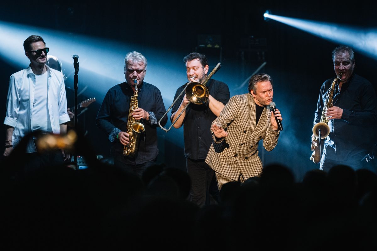 Na fotografii z pondělního koncertu jsou zpěvák Ondřej Ruml, altsaxofonista Radek Kašpar, trombonista Filip Jelínek, zpěvák Matěj Ruppert a tenorsaxofonista František Kop.