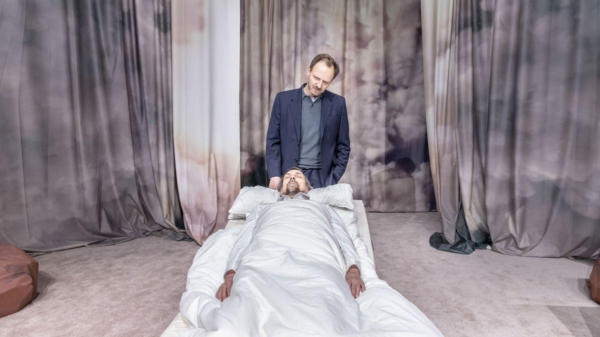 Univerzální scéna umožňuje rychlé přechody z jedné situace do druhé, které se hlavně díky herecké přesnosti prolínají tak hladce, že si jich lze sotva povšimnout. Jedním z mála konkrétních objektů zůstává nemocniční lůžko mobilizované hereckou akcí.