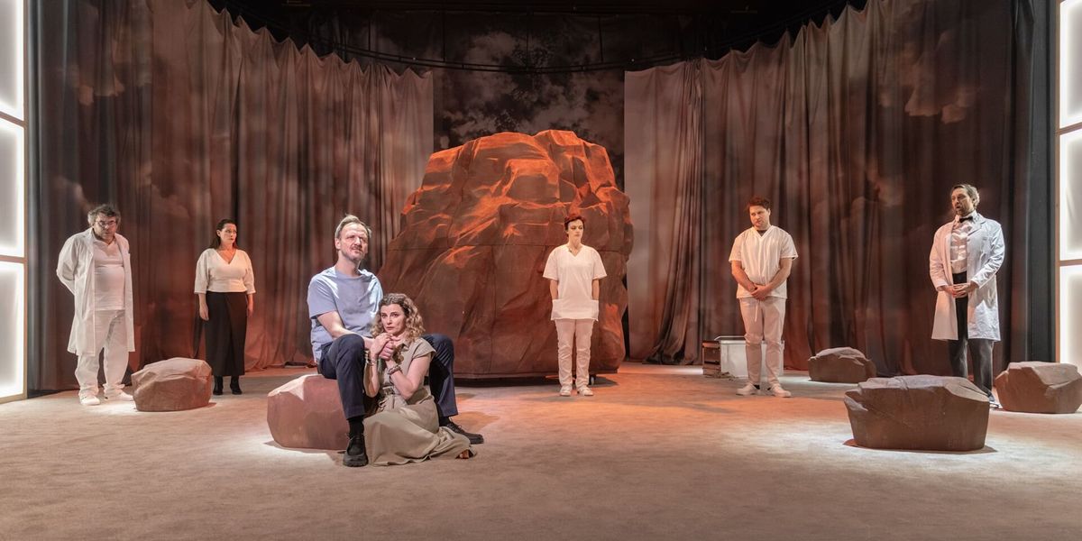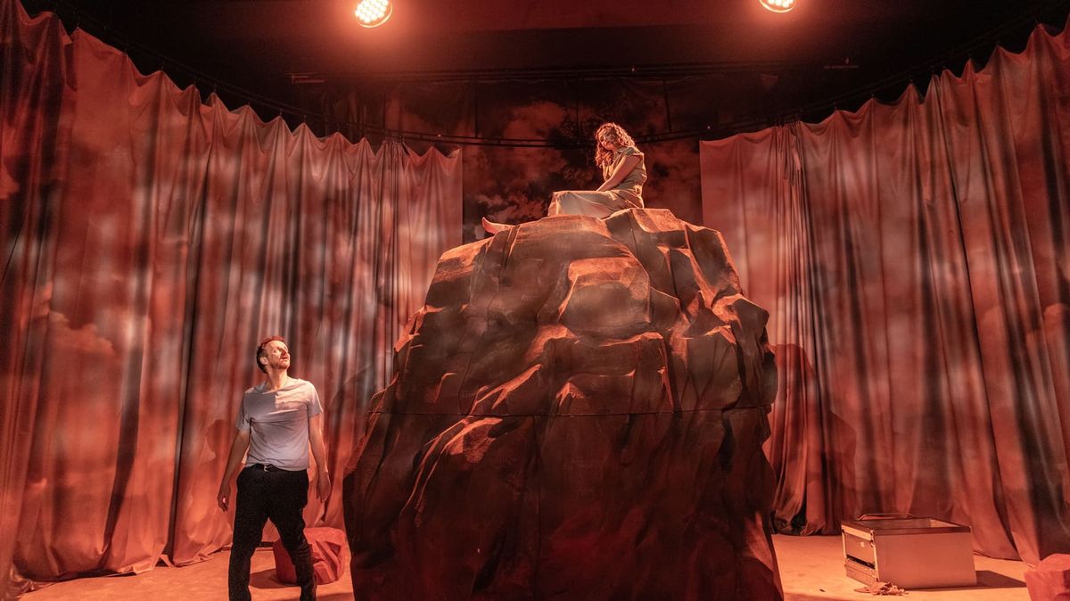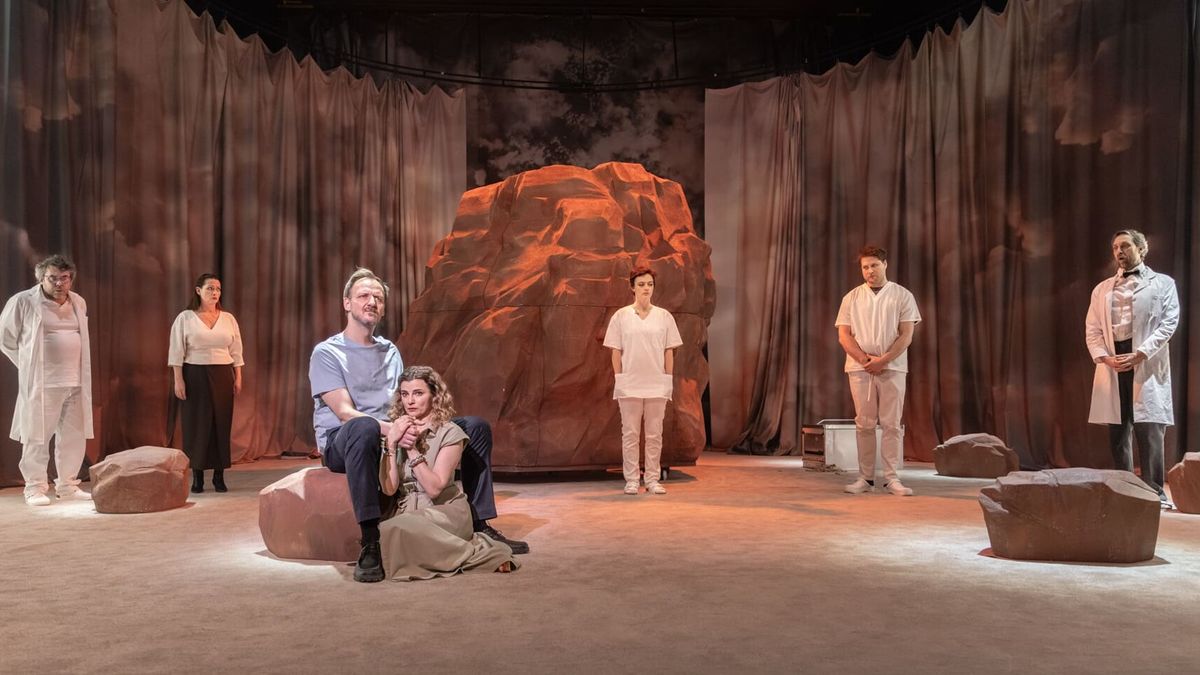 V tu chvíli scéně dominuje obrovská masa kamene, na níž oba herci spočinou. Může symbolizovat biblickou Olivetskou horu, stejně jako narůstající nádor v hrdinově těle. Od začátku jej předznamenávalo několik menších kamenů rozmístěných po jevišti, které uzavírá dvojitý půlkruhový závěs, barevností připomínající nebesa.