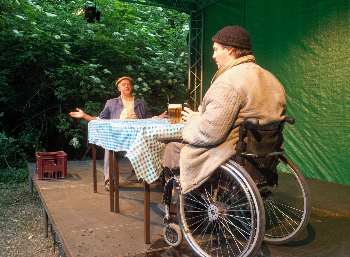 Jakub Špalek a Jan Potměšil v inscenaci Audience od Václava Havla, kterou uvedli na festivalu Habrovka.