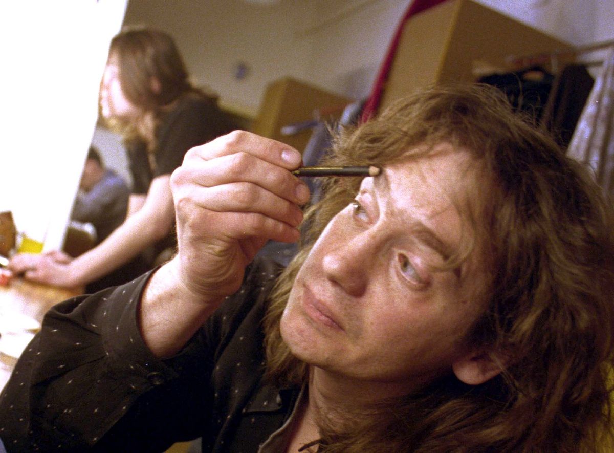 Na fotografii z roku 2000 se Jan Potměšil v šatně připravuje na večerní představení Růže pro Algernon v brněnském Divadle Bolka Polívky.